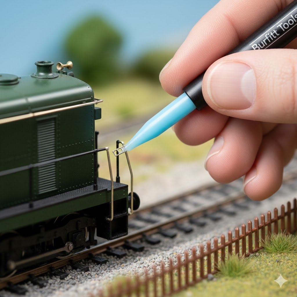 A close-up shot of a modeller’s hand using the wax tip of the Burfitt Dual-Tip Precision Micro-Handler to carefully pick up and place a miniature detail (e.g., a tiny plastic lamp, a handrail stanchion, or a delicate brass part) onto the side of a model train locomotive or a railway car. The focus is on the precision and the ease of handling small, fiddly train components.