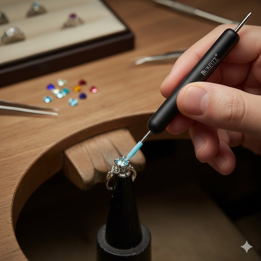 Description: A close-up of a jeweler or hobbyist’s hand using the wax tip of the Burfitt Dual-Tip Precision Micro-Handler to precisely pick up and place a tiny, faceted gemstone into a jewelry setting (like a ring or pendant). The focus is on the delicate, non-damaging grip of the wax tip, demonstrating its utility for intricate, non-modeling precision work.