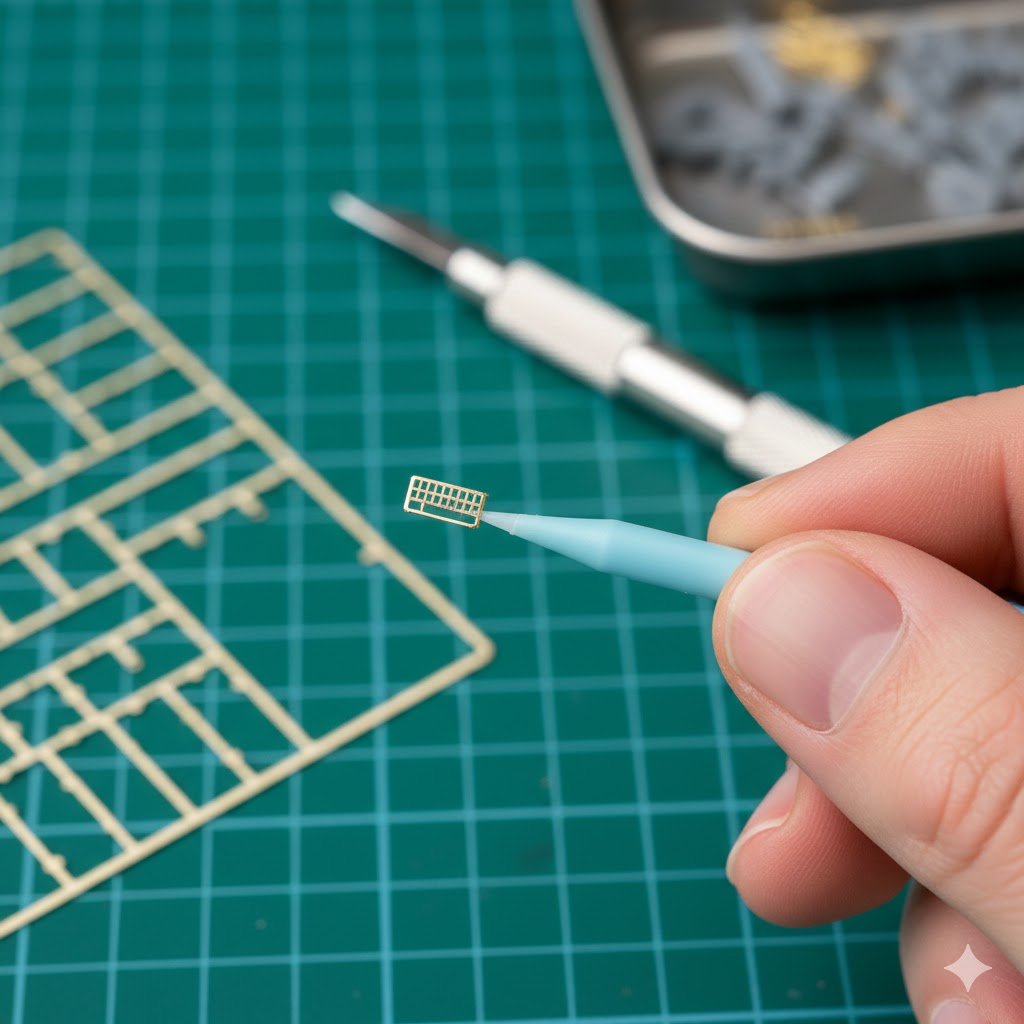 A close-up shot focusing on a modeller’s hand gently using the wax tip of the Burfitt Dual-Tip Precision Micro-Handler to pick up a tiny, intricate piece of photo-etch (PE) from a cutting mat or a small tray. The PE part is clearly adhered to the wax tip, ready for placement. The modeller’s face is out of frame, emphasizing the tool and the delicate task.
